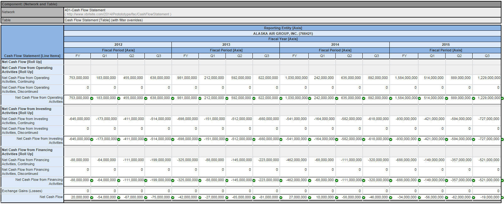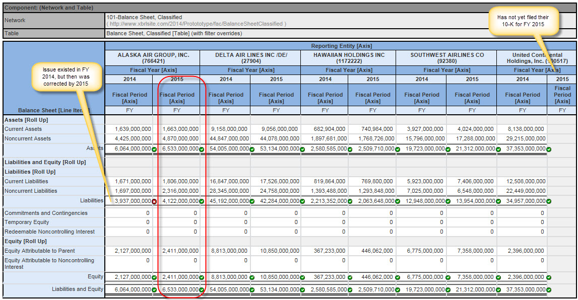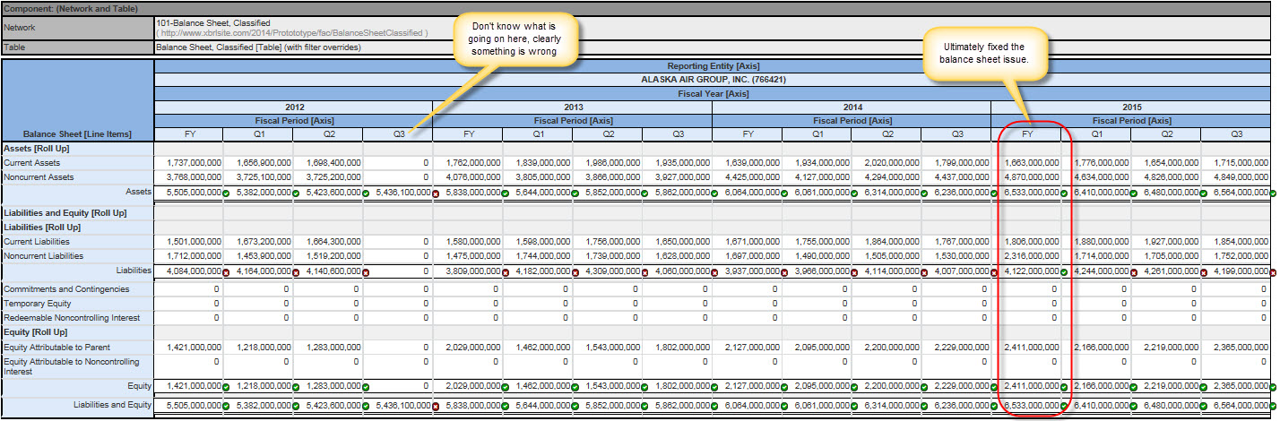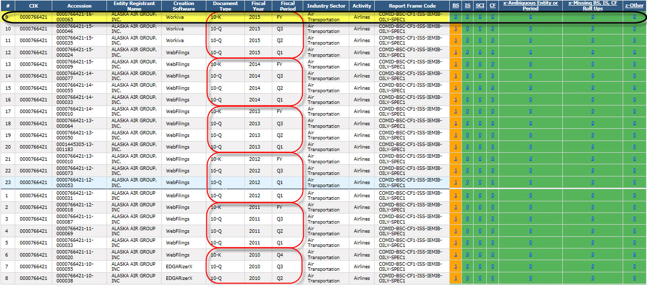 STEP #1: COMPARISON OF ALL FILINGS. A filer should use all prior reports that they have filed to help them understand if a current report is CORRECT. Below you see 100% of the filings for Alaska Airlines. Notice how the filings are in descending order, most current filing first then descending to the first filing. Notice how EVERY FILING had an ERROR except for the LAST filing! I sent this information about this error to the Alaska Airlines investor relations department. They looked at the information I provided and determined that I was correct, agreeing with me that this was an error. They fixed the error and you can see ALL GREEN for the 10-K filing. Further, any FUTURE filing should be ALL GREEN for ALL TESTS for the minimum criteria.