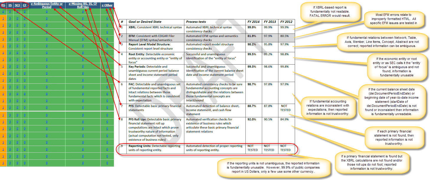 STEP #3: Peer Comparison: EVERY company has peers. Peers might be other companies in the industry the reporting entity is on or really any reporting entity that uses the same reporting style. CLEARLY if two different public companies report the same information the representation of that information should be EXACTLY THE SAME at the high level of the fundamental accounting concepts. If this is NOT THE CASE, then there should be a SPECIFIC REASON for the difference; that might result in (a) a NEW reporting style should be created or (b) some error in the mappings, impute rules, or other fundamental accounting concept metadata should be fixed, or (c) some issue exists in the US GAAP XBRL Taxonomy exists and should be fixed. There are NO OTHER REASONS that an inconsistency would result; either the filer made a mistake, the testing metadata has a mistake, or the US GAAP XBRL Taxonomy has a mistake.